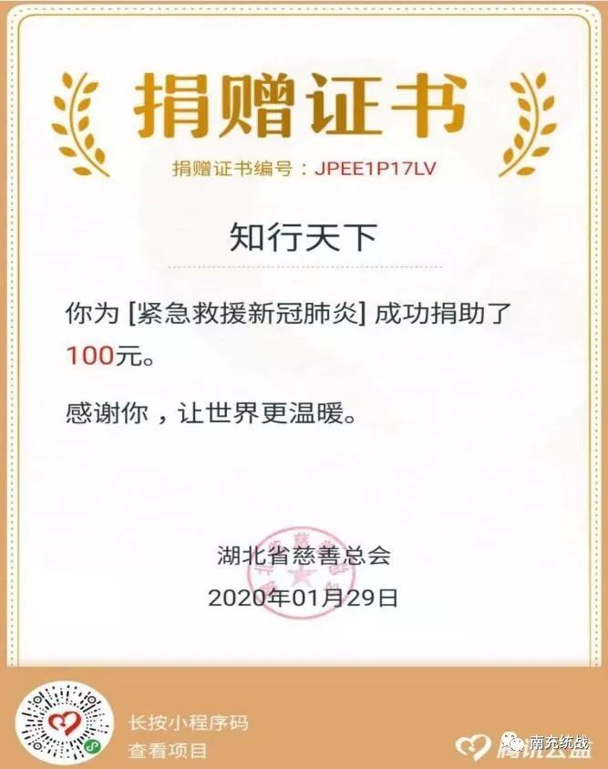 疫情肆虐,防控工作正处于关键时期。疫情无情人有情,在这场没有硝烟的战争中,不仅需要那些最美逆行者的勇敢奋战,更需要每一个普通人的自觉行动和大力支持。涓涓细流汇大海,默默支持聚力量,让我们大家一起同心协力,共克时艰!(民盟南充市委) |