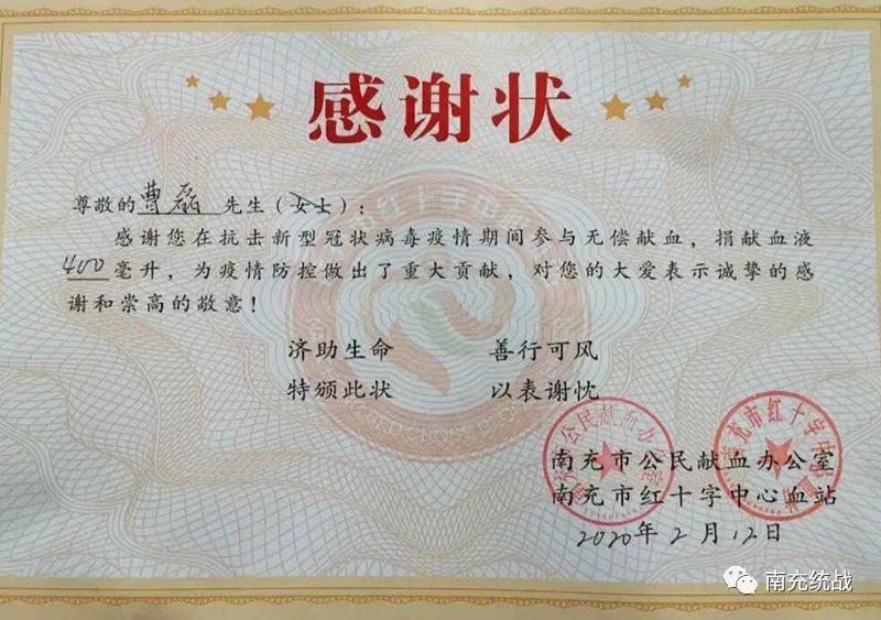 盟员曹磊,民盟阆中市委副主委,阆中市人民医院消化内科主任。做为一名医生他一直冲在抗击战的第一线,尽管每天的工作让他疲惫不堪,但即便如此,在得知医院临床缺血,大家都封闭在家无法献血的情况下,主动来到血站进行献血,有力地践行了一个医生的誓词。