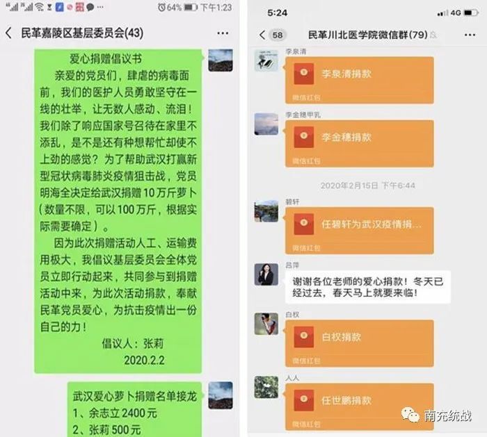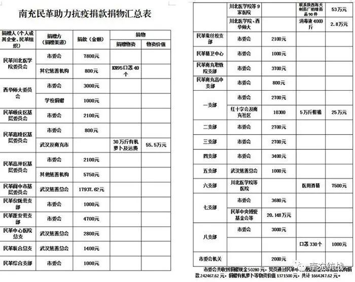 据不完全统计,截至2月24日,全市民革党员共捐款捐物价值人民币166万余元。其中:捐赠现金29万余元,捐赠有机萝卜、消毒液、抗疫药品等物资折合人民币137万余元。