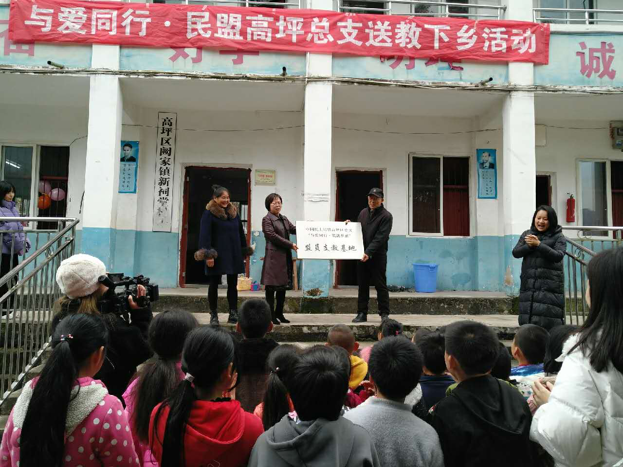 民盟高坪总支“与爱同行·筑就梦想”盟员支教基地在阙家镇联盟村光明小学正式成立,主委滕晓燕与坚守小学十几年的两位老师共同完成了挂牌仪式。自2014年起,民盟高坪区总支始终关心着村小的孩子们,为补齐村小基础设施和师资力量的短板,通过发挥民盟界别优势,引导整合社会各界力量支持小学建设,先后为学校添置了运动设施,捐赠了电饭锅、电钢琴、电冰箱等物资,并在每年的儿童节开展“红鼻子六一”募捐活动,为孩子送来学习用具。针对孩子们的学习弱项,定期组织盟员赴学校讲授美术、音乐、体育等课程,极大启发了孩子们的心智,促进了孩子们德智体全面发展。