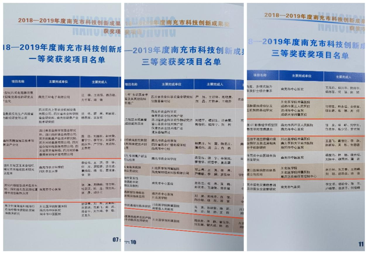 经过评审,由南充市农业科学院盟员李钟、蒲全波参与的“四川丘陵区玉米全程机械化节本增效技术研究及应用”,由南充市中心医院盟员周晓晴参与的“消化内镜微创技术在胃石症、消化道出血及消化道瘘中的创新性应用”2个项目获得一等奖。由川北医学院附属医院盟员周洪贵参与的“高强度聚焦超声在妇产科疾病中的临床应用研究”,熊永福参与的“大肠肿瘤病理特征及发生机制的基础研究”,戴俊臣参与的“结直肠平坦型腺瘤内镜诊治特征及其进展相关的分子机制研究”,以及由川北医学院盟员朱万春参与的“儿童口腔疾病防控体系的建立与应用”,由南充市中医医院盟员魏照洲参与的“慢性胃炎中西医结合治疗方案研究”5个项目获得三等奖。由盟员参与的项目占获奖总项目的16%。