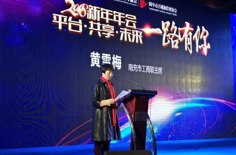 南充市工商联主席黄雪梅在讲话中,对本次活动的成功举办表示了热烈的祝贺。她表示,本次阆中商界新年年会规格高、流程顺畅、内容务实,是一场知识与智慧的盛宴。她希望各位青年企业家,在市委、市政府的坚强领导下,加强交流、互助合作、共谋发展,热心公益,树好形象,为阆中全面建成小康社会再立新功。
