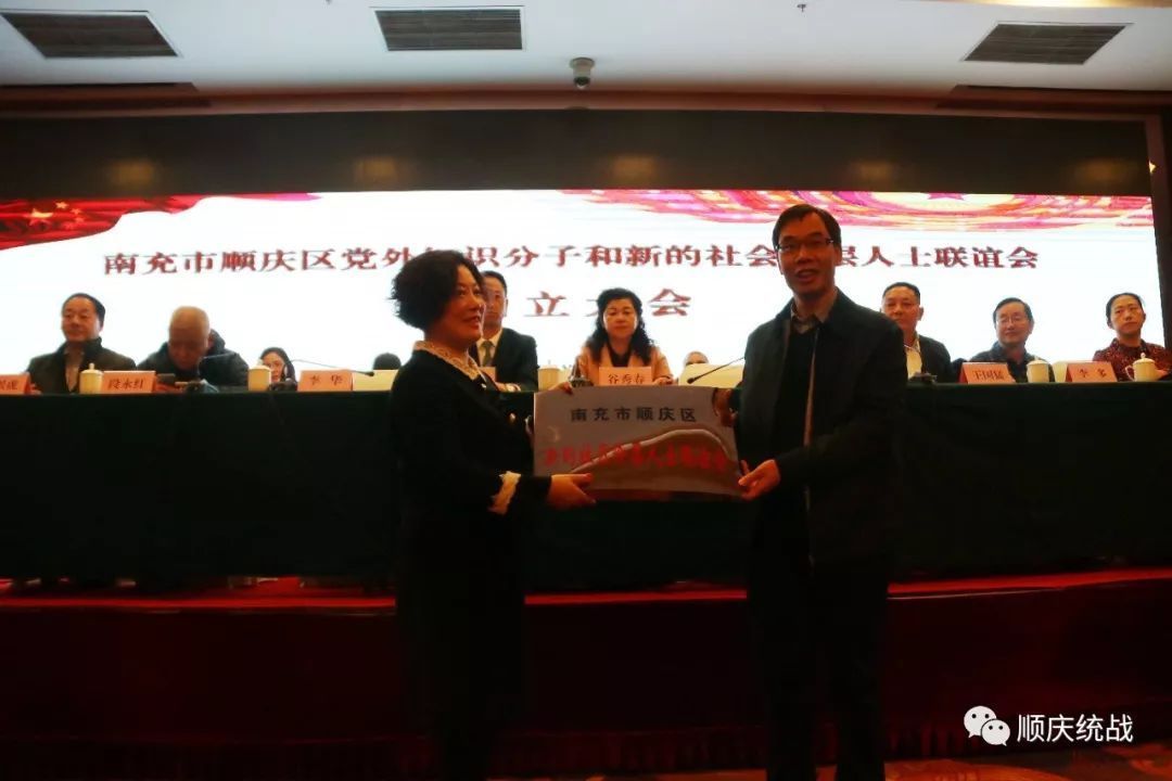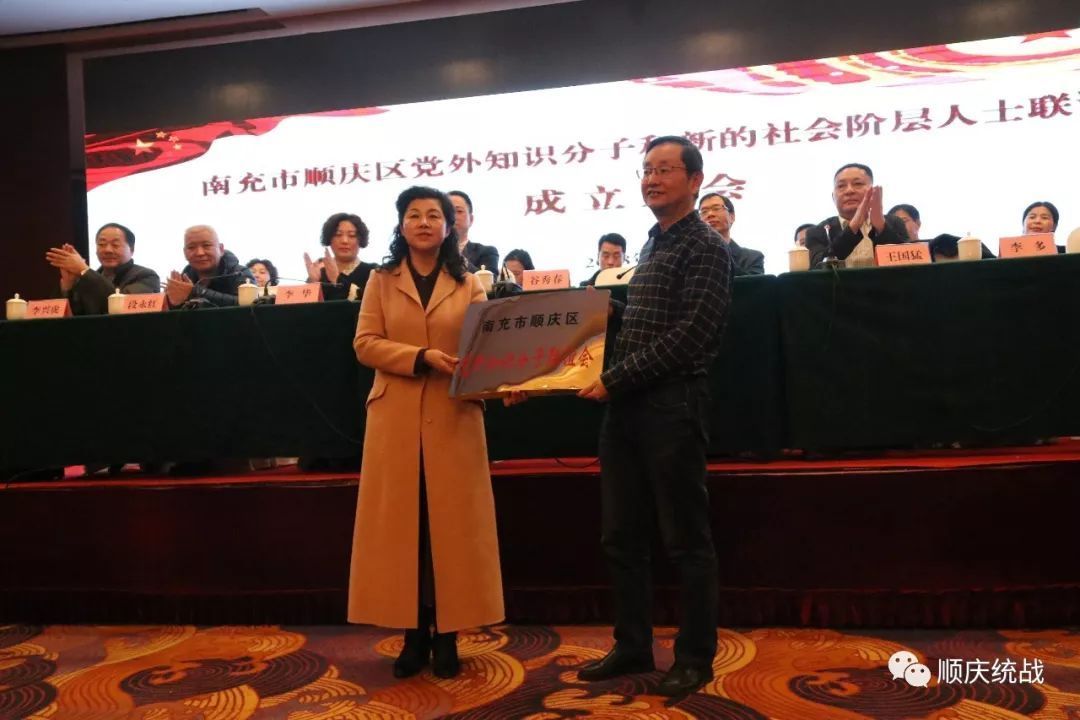 成立大会上,谷秀春为南充市顺庆区党外知识分子联谊会授牌、李建中为南充市顺庆区新的社会阶层人士联谊会授牌。当选的知联会会长李多和新联会会长李华分别作了表态发言。