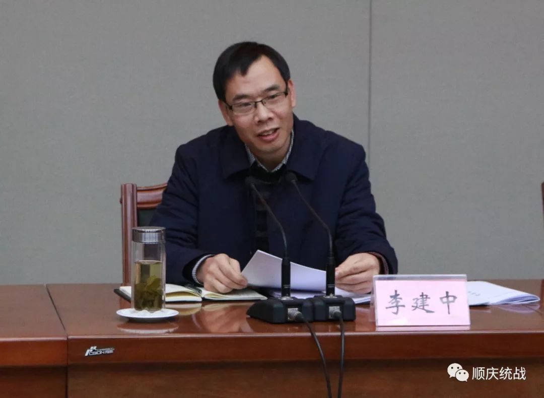 李建中对2018年顺庆区各民主党派、工商联在思想建设、参政议政、社会服务、组织建设等方面取得的成绩表示了充分肯定。他指出:顺庆统一战线全体成员在过去的一年突出思想建设主线、围绕发展建设主体、聚焦参政议政主业,倾情用心用力,各项工作呈现出百花齐放、各具特色的好局面,取得了喜人的“十张成绩单”。这些成绩的取得,既是区委坚强领导的结果,也是民主党派奋斗的成效;既是统战工作的特色,也是各党派的骄傲;既是统战工作的倾情努力,也是各党派的辛勤付出。值得在座的所有同志自豪、欣喜。