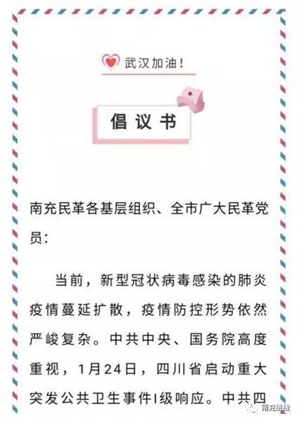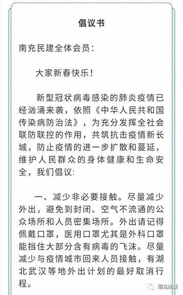 自我省启动重大突发公共卫生事件一级响应以来,南充市各民主党派市(工)委积极响应,迅速行动、广泛动员,纷纷通过官网、微信公众号发出倡议书。号召广大成员坚决贯彻落实中共中央、中共四川省委和中共南充市委要求,自觉把疫情防控工作作为当前最重要最紧迫的工作任务,增强责任意识和防护意识,齐心协力、同舟共济,共同打好疫情防控阻击战。