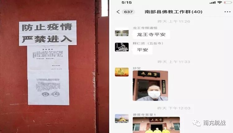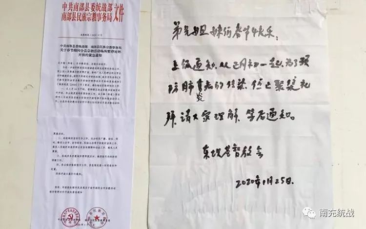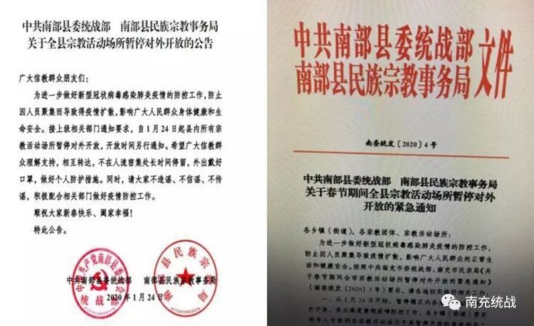 1月20日,县委统战部结合春节期间重点场所“两保”工作,将疫情防控工作纳入重要内容,2次召开专题会议研究部署宗教领域疫情防控工作。1月23日收到市民宗局下发的紧急通知后,立即组织各宗教团体负责人和民宗股工作人员召开专题会议,沟通宗教活动场所关停方案,细化工作举措,并通过党政网、微信群和电话等方式连夜下发紧急通知。1月24日,县委统战部庚即下发《关于春节期间全县宗教活动场所暂停对外开放的通知》,所有办公室电话机齐上阵,短短半小时内,所有乡镇、街道党(工)委书记闻令而动,迅速贴通告、设卡口、配人力、广宣传,全县所有宗教场所关停工作在春晚开始前落实到位。与此同时,县委统战部的公告和倡议书通过微南部、微播南部、南部手机台、南部电视台、24365平台等融媒体平台传进南部千家万户。全县宗教工作“三级网络”也迅速运转,近1200名统战委员、统战工作联络员、统战工作信息员及社区网格员立即动员,通过村广播、手持喇叭、宣传单等进村入户广泛宣传宗教场所暂停对外开放的相关信息,有效确保了除夕夜无一例群众聚集祈福活动发生,为全县后期摸排工作"零增负"。
