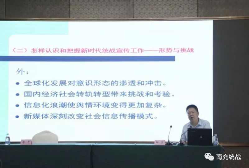 6月23日,全市统战信息宣传工作培训班举行。培训邀请省委统战部宣传文化处处长邱江同志、省委统战部办公室三级调研员徐昱同志、市委办信息室副主任邓鑫同志辅导授课。各县(市、区)党委统战部,各民主党派市(工)委和市工商联,西华师范大学、西南石油大学、川北医学院、南充职业技术学院党委统战部,市新联会、知联会、光彩事业促进会,市委统战部相关科室共60余人参加培训。