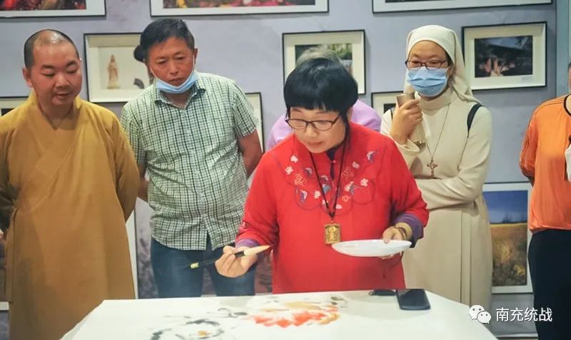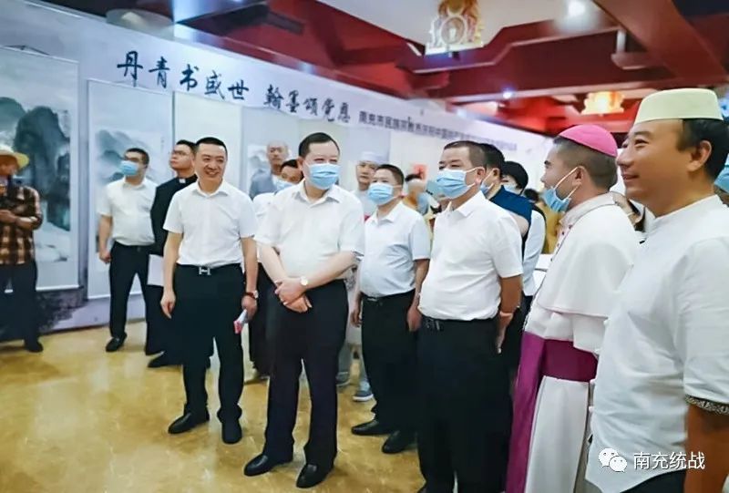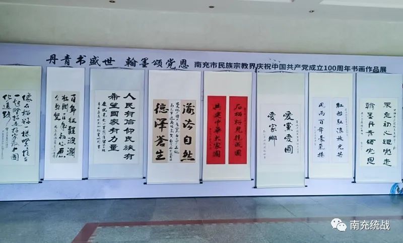 当天上午,举行了“丹青书盛世 翰墨颂党恩”南充市民族宗教界庆祝中国共产党成立100周年书画作品展。100余幅作品既有大气脱俗、纯朴厚重的书法珍品,又有清逸灵动、自然清新的绘画摄影,还有惟妙惟肖、形态万千的剪纸艺术,幅幅作品均饱含着全市民族宗教界爱国爱教人士对中国共产党的无限热爱之情,彰显了同心同德感党恩、同向同行跟党走的政治自觉,汇聚了奋进新时代、迈向新征程的磅礴伟力。