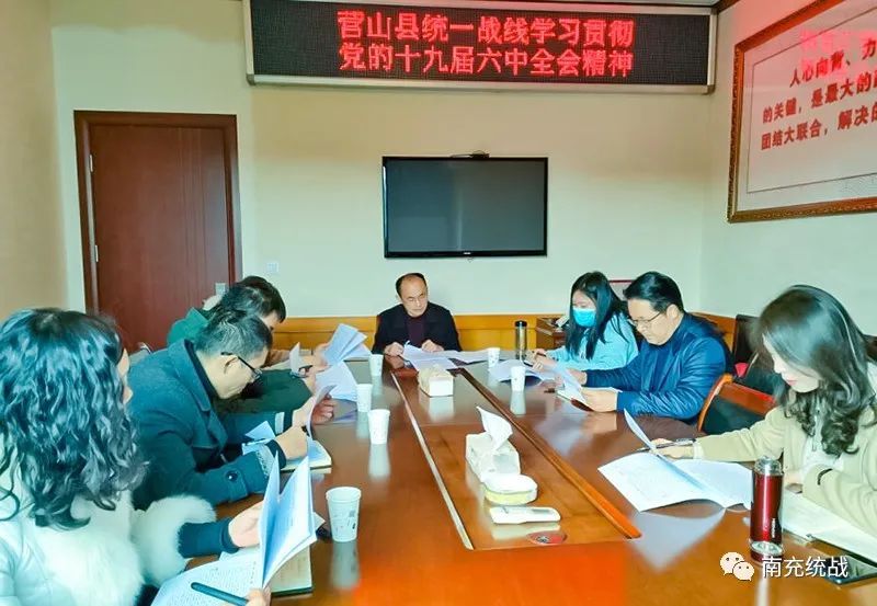 11月23日,营山县委统战部召开专题会议,传达学习党的十九届六中全会精神,研究贯彻落实措施。县委统战部机关干部、各民主党派、工商联、新联会、知联会等负责人参加会议。