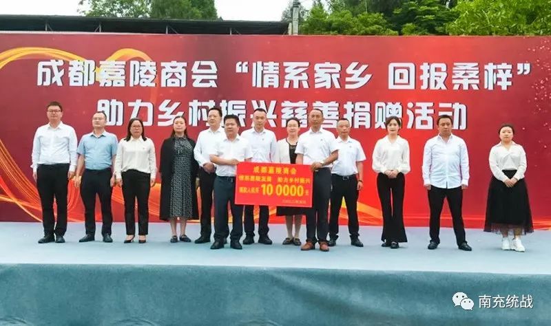近日,成都嘉陵商会在南充市统计局、嘉陵区委统战部、区工商联等部门协调指导下,南充市统计局局长刘献文、嘉陵区工商联主席胡娟、成都嘉陵商会会长彭帅一行,前往嘉陵区金宝镇青家沟村,开展“情系家乡·回报桑梓”活动,为该村送上10万元捐款,迈出了“万企兴万村”的坚实步伐。区政协主席白青云,市统计局党组成员、副局长何强,区政协秘书长陈静,成都嘉陵商会支部书记王健出席捐赠仪式。