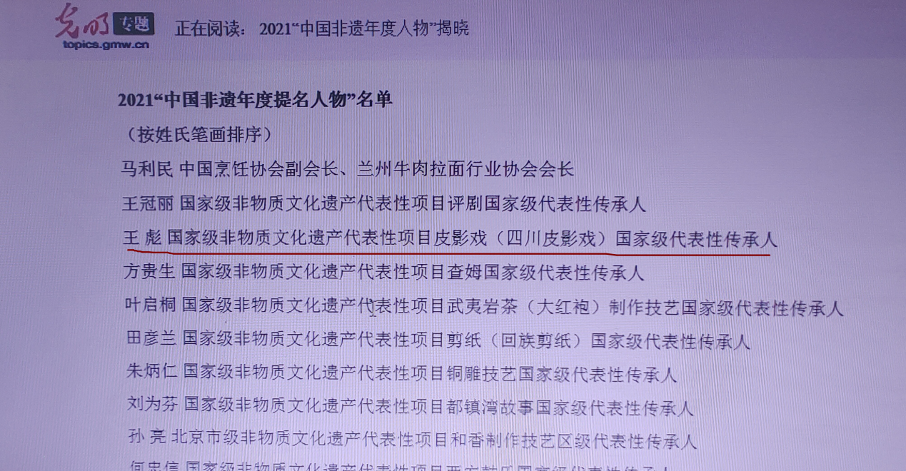 6月11日,由文化和旅游部非遗司指导,光明网、“文化强国”光明日报协同推广平台承办的2021年“中国非遗年度人物”推选宣传活动推选结果正式公布。共10人入选2021“中国非遗年度人物”,20人入选2021“中国非遗年度提名人物”。其中,阆中盟员、国家级非物质文化遗产代表性项目皮影戏(四川皮影戏)国家级代表性传承人王彪入选2021“中国非遗年度提名人物”。