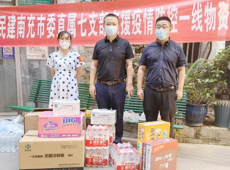 8月24日,民建南充市委直属三支部主委程海珍率队为顺庆区果山街社区和顺庆区特警大队红光路警务站抗疫一线工作者送去矿泉水20件,口罩500个,霍香正气液20盒。民建南充市委直属七支部副主委李鸿代表支部向顺庆区解放街社区送去价值3000多元的医用物质和生活物资,解决了该社区物资紧缺的燃眉之急。市直十二支部会员、南充市爱跑团团长余斌将筹措到的350件矿泉水、100件饮料、12000个医用口罩、100盒藿香正气送到了嘉陵区、高坪区一线抗疫人员手中。民建顺庆区企业支部为顺庆区西城街道解放街社区、红花街社区战疫一线社区工作者送去100余件矿泉水。