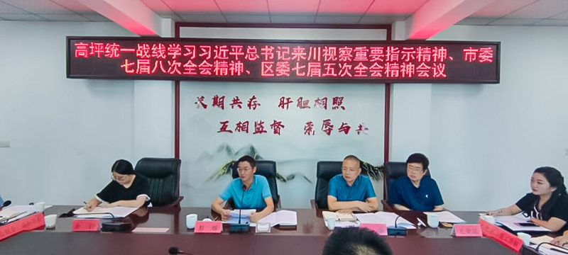 8月15日,高坪统一战线组织召开专题会议,传达学习习近平总书记来川视察重要指示精神、中共南充市委七届八次全会精神、中共南充市高坪区委七届五次全会精神。区委常委、统战部部长彭辉主持会议并讲话,区政协副主席林鸿斌、滕晓燕参加会议,各民主党派、工商联、无党派人士等结合自身工作实际作了交流发言。