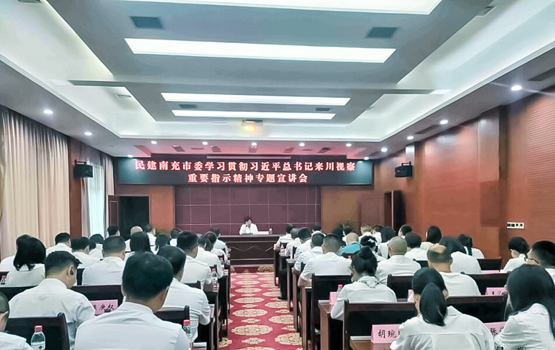 会议强调,习近平总书记这次来川视察作出的重要指示,视野宏阔、思想深邃、重点突出,是习近平新时代中国特色社会主义思想“四川篇”的最新发展,是对新时代治蜀兴川事业发展的最权威最深刻最有力的科学指引。全市各级民建组织要旗帜鲜明讲政治,坚决抓好习近平总书记来川视察重要指示精神学习宣传贯彻,结合省委十二届三次全会精神和市委七届八次全会精神,以实实在在的工作成效体现贯彻落实的实效。一要持续深入抓好学习宣讲。在学习领会中明思路、找方法,在宣传宣讲中聚人心、凝合力,切实将总书记的深切关怀和殷殷嘱托转化为推进本职工作和基层组织发展的奋进之力。二要持续深入抓好主题教育。以执政党为师,扎实推进“凝心铸魂强根基、团结奋进新征程”主题教育,不断加强思想引领、强化使命担当,引导全市会员以学铸魂、以学增智、以学正风、以学促干,推动南充民建事业实现新发展、取得新成效。三要持续深入抓好贯彻落实。深刻领会把握习近平总书记提出的“四个发力”重要要求,紧紧围绕“现代化南充建设的总体谋划”“七个中心”建设等重点工作,发挥界别优势,真抓实干、担当作为,为南充组团培育省域经济副中心、加快建设成渝地区北部现代化中心城市贡献民建智慧和力量。
